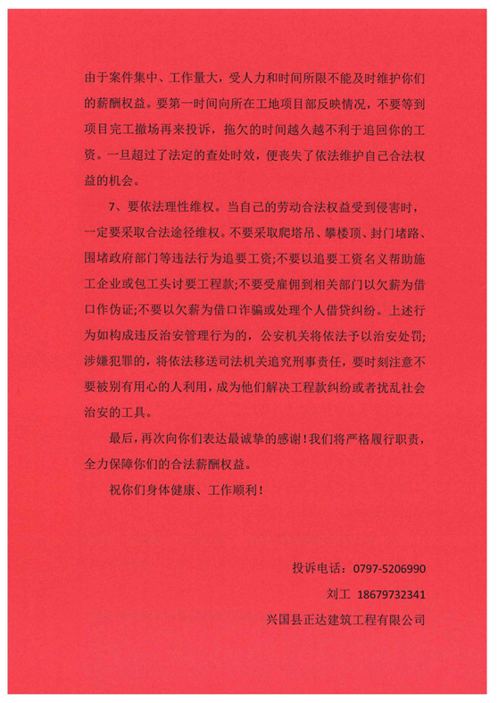 年关将至,为进一步做好公司农民工工资支付工作,维护农民工的合法权益,杜绝出现劳务纠纷、欠薪、恶意讨薪等情况。兴国城投正达公司组织开展农民工工资维权专项整治工作,通过召开会议、现场摸排、张贴维权公告等方式,深入各在建工地开展农民工工资维权宣传工作。