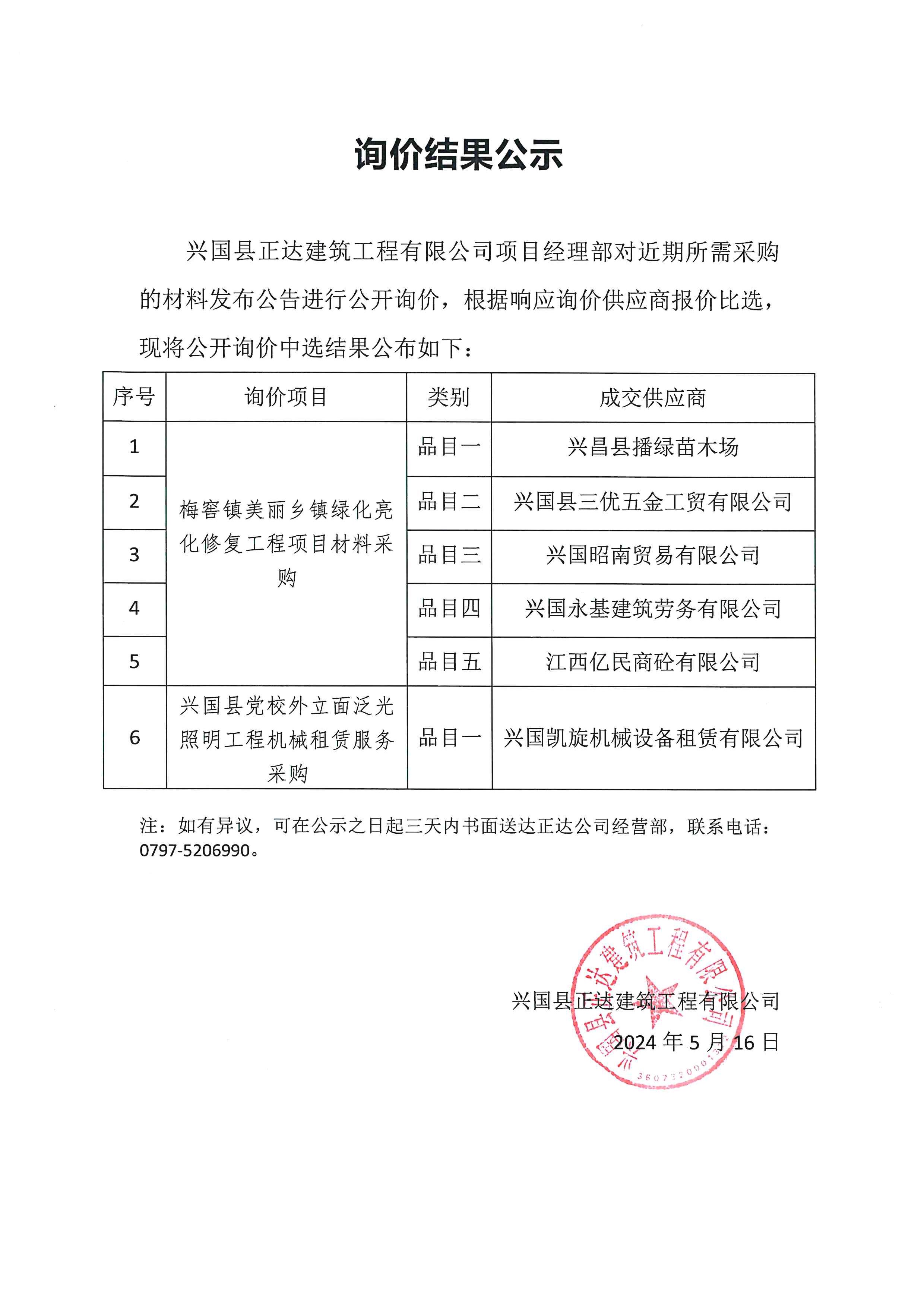 询价结果公示