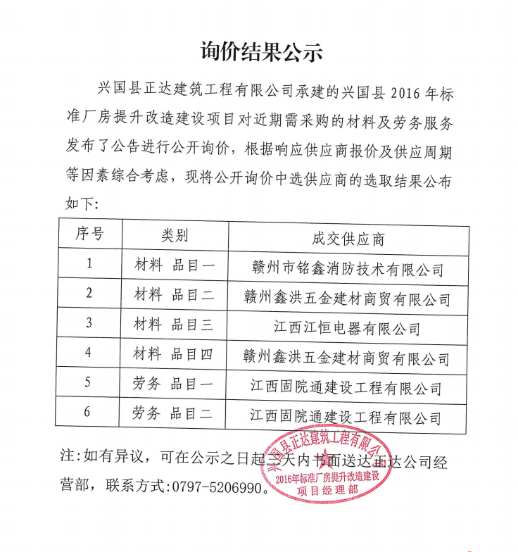 2016年标准厂房提升改造建设项目劳务、材料采购询价结果公示