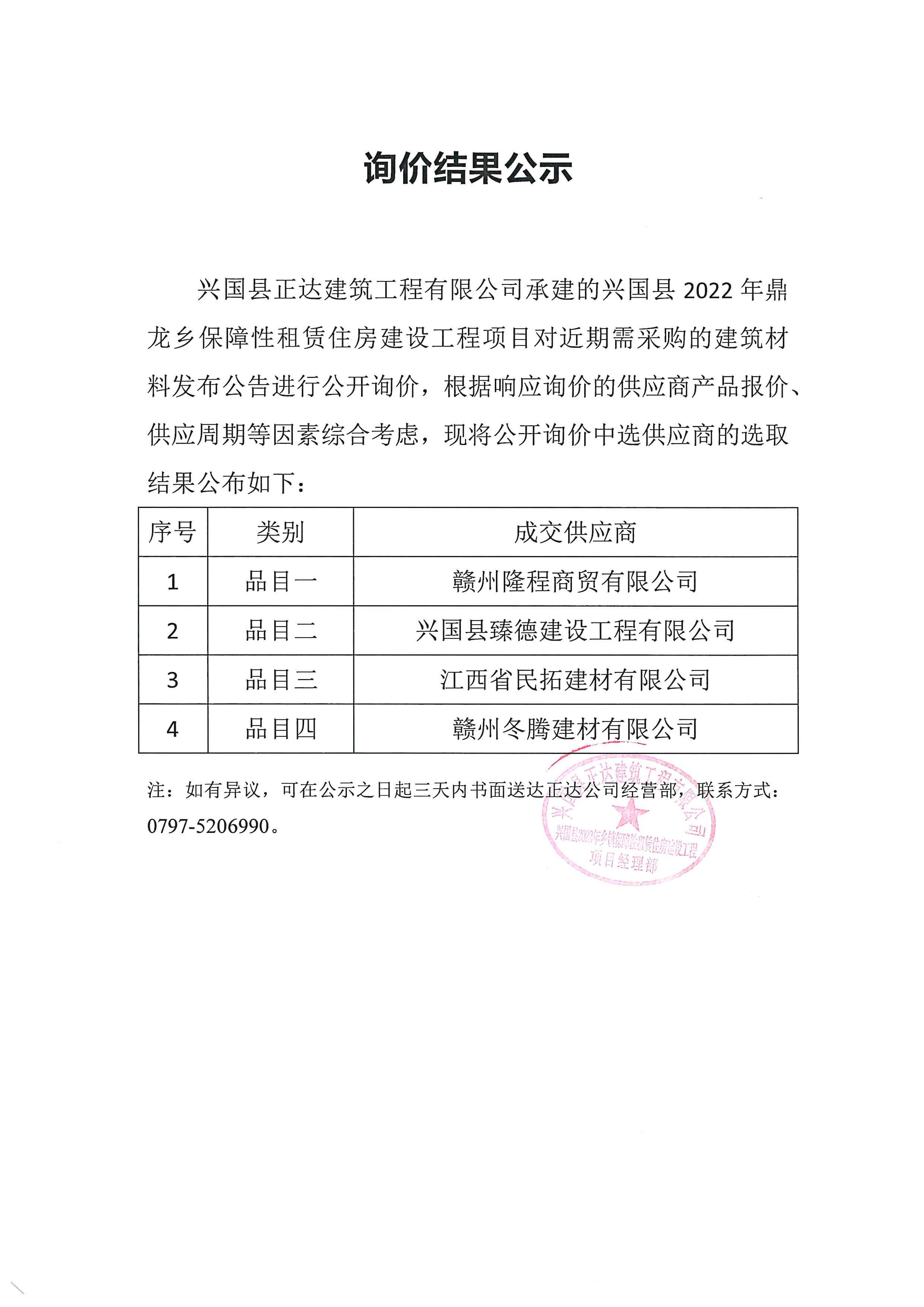 兴国县2022年鼎龙乡保障性租赁住房建设工程项目材料采购公开询价结果公示